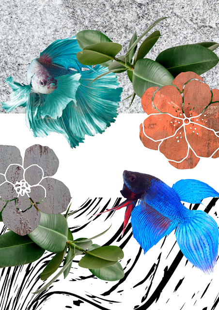 For the second composition I have used the pattern images on the top and bottom of the composition as the background, then, using the shape tool, I created some flowers and masked the other image patterns available onto it, and added the leaf in as it made sense with the flowers, repeating this on the top and bottom, throughout the whole image, I tried to mirror the top and bottom elements in the opposite direction of each other at the same time only with some different images. As a final step, I then added in the fishes facing towards each other as if there were swimming to each other and in the same tank.
