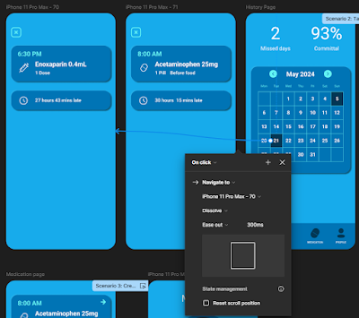I also proceeded to add the rest of the animations for the wireframes. Most of the animating process was in the main functionality of the app which was adding a medication reminder. For going to the previous page I used the → push animation, and the ← push for going to the next page. I have also set most of them to slow to feel more visually comfortable and cohesive.