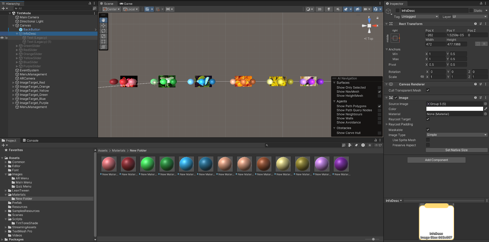 In the "Detect Multi AR" script, similar to the logic I used for the purple and yellow combination to produce a brown sphere, I applied the same approach for the new pairs. For example, when the green and red descriptions are detected together, their respective 3D sphere and colour info descriptions will be displayed in AR.